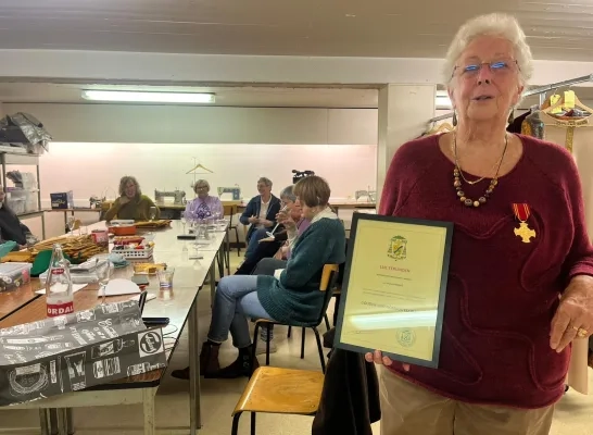 Feest gisteren in de kelder van het Centrum Onze Lieve Vrouw van Halle, waar het kledijatelier van de Mariaprocessie is gevestigd. In het bijzijn van al haar collega-vrijwilligers kreeg Myriam Renaux voor haar jarenlange en tomeloze inzet voor de processie de hoogste kerkelijke onderscheiding voor een leek, het Gouden Sint-Romboutskruis.